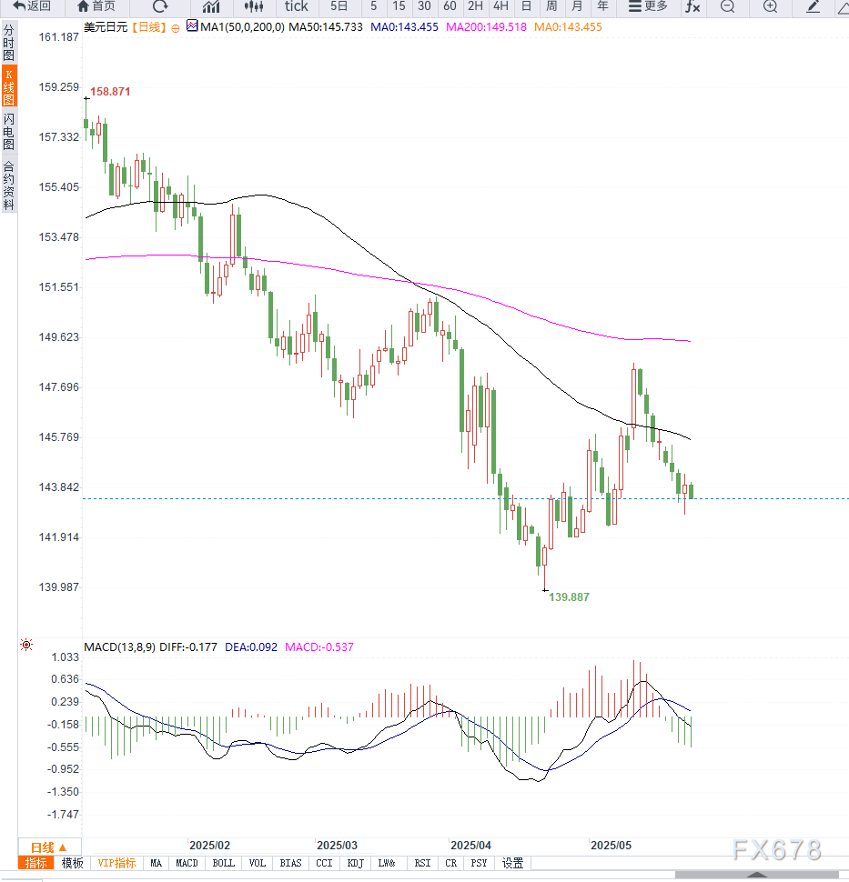 从美元兑日元(USD/JPY)日线图来看,短期维持震荡下行,且美元指数依然未能有效突破均线压力,叠加避险情绪走强,美元兑日元有望进一步走低。